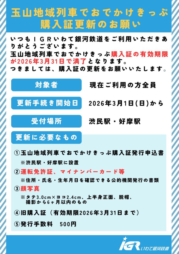 - 2026.02.09お知らせ 「玉山地域 列車でおでかけきっぷ」購入証更新のお願い
